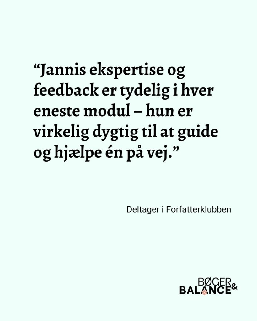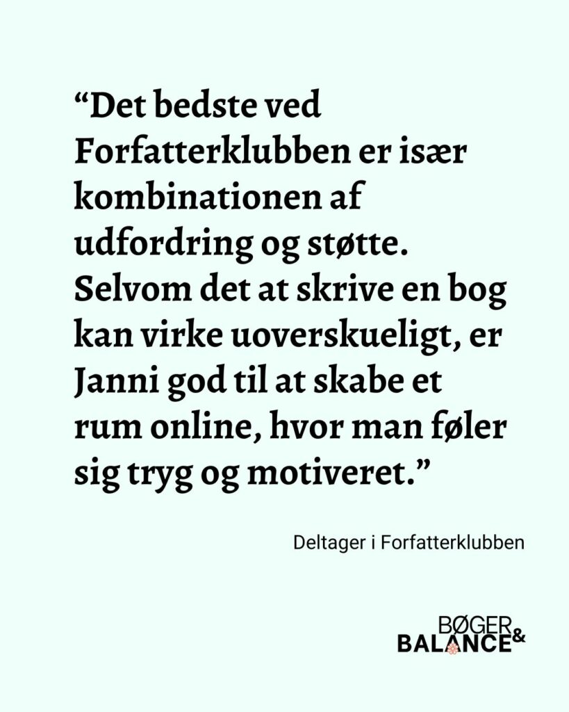 Fra starten fik jeg strukturen på bogen på plads ved hjælpe af onlinekurset og Jannis sparring. Herefter forpligtede jeg mig selv til at få skrevet, og de løbende deadlines og sparring undervejs fik mig i mål. Jeg ville ikke være blevet færdig uden Forfatterklubben.”