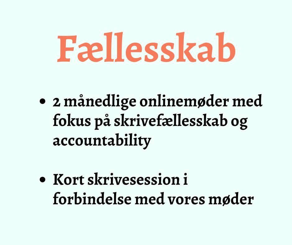 At være omgivet af andre skrivende, hvor alle arbejder mod lignende mål og kan dele erfaringer, udfordringer og sejre, skaber en vedvarende skriveenergi og motivation, som hjælper dig til at komme i mål.
