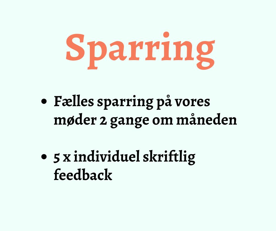 Hver måned (undtagen juli) har du mulighed for at få individuel skriftlig feedback på et par siders tekst eller sparring på en udfordring, du har netop nu. På den måde sikrer vi, at din bog er på rette vej.