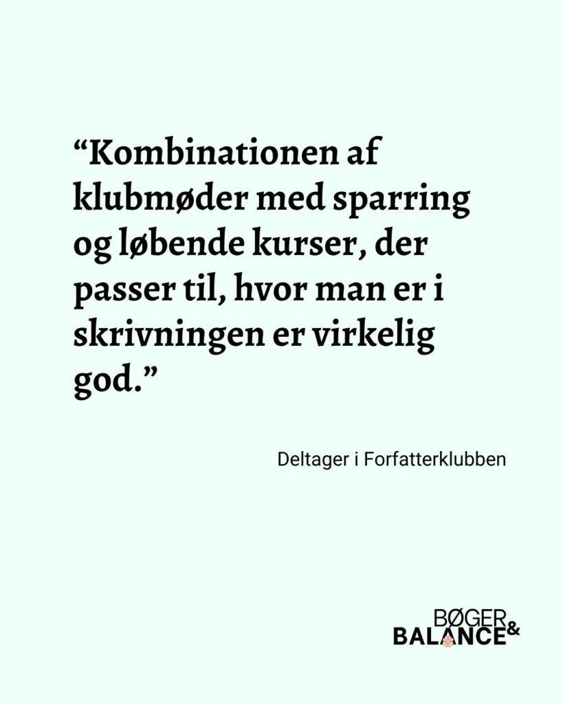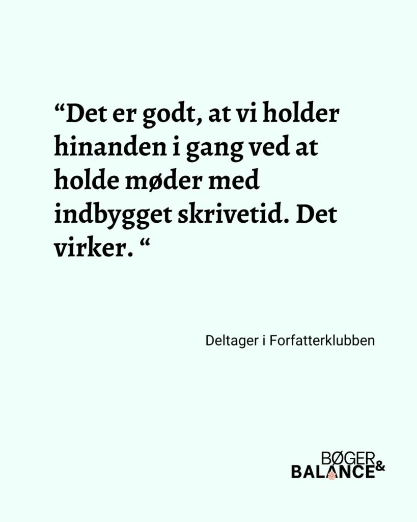 Som forfattere har vi mulighed for at sætte farten ned og fordybe os, når vi skriver vores bog, og processen skal være en god blanding af skriveglæde, god energi og fremdrift. Det er mit fokus i alt, hvad jeg laver. Også Forfatterklubben.
